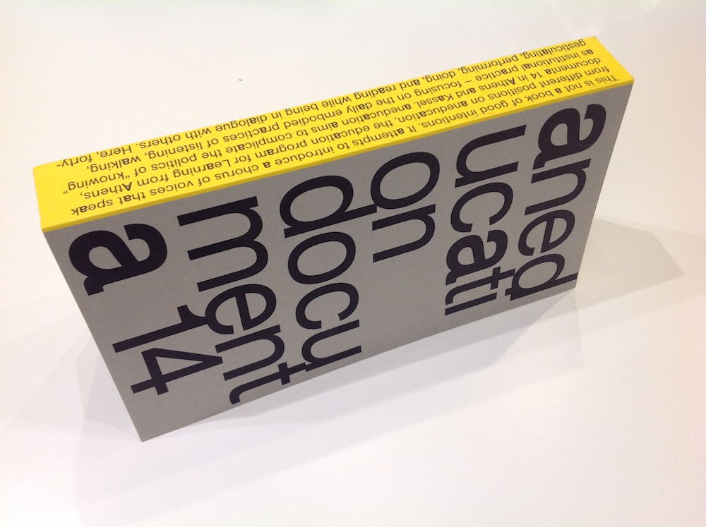 As a primary discursive site within the documenta 14 programming, aneducation aimed to complicate the politics of “knowing” as institutional practice through the daily embodied practices of listening, walking, gesticulating, performing, doing and reading. The book brings together voices from the documenta 14 education program – including the aneducation team and documenta 14 Chorus, as well as curators, artists, and educators – that speak from different positions on aneducation and present desires for other sites of learning.