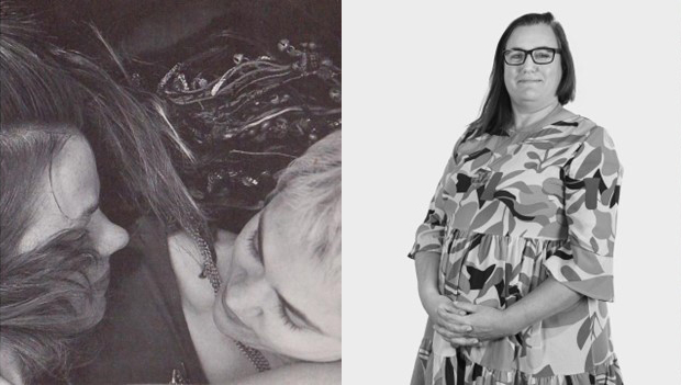 Left: Kiss & Tell, Drawing the Line (detail), photograph, 1990. Courtesy of Kiss & Tell. Right: Kristen Hutchinson.