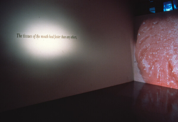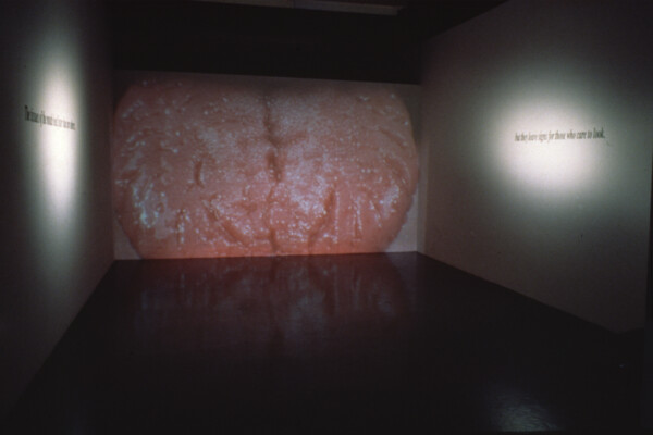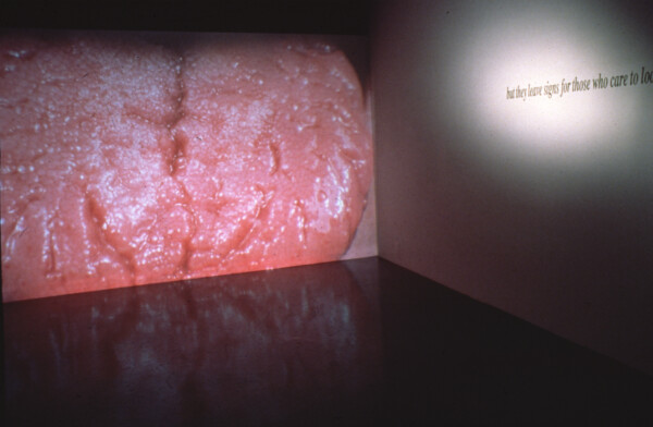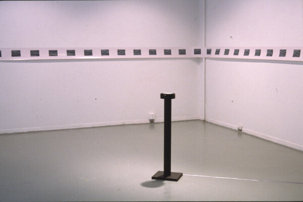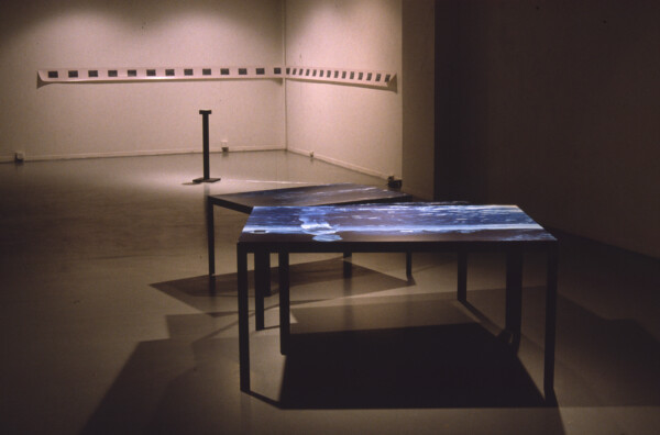 The artist has written: ‘As an installation bleuira points away from that will to chart and name an unknown territory, to reduce meaning to points of exclusion. A direct translation of ‘bleuira’from the French would be; to become blue. The title is derived from a compilation of letters exchanged between Violet Trefusis and Vita Sackville-West. “Quand bleuira sur l’horizon la Desirade.” Here, when translated, bleuira describes that moment when the coastline disappears from the horizon. The exhibition consists of ten, circular steel light boxes illuminating photographic transparencies of the ocean. A compass, embedded in a binnacle stands on the gallery floor. An electronic magnet eases the compass. It slowly moves in a half circle away from north and back again. Sliding the balance again and again from “a truth”, from a specific location to one imagined. Fragmenting the universal and oceanic. Navigating in the peripheries.’ “And what is that terror awaiting them in the shadow? That featureless memory of the terrible fight between slashing breakers and the streaming sails? That peril of water coming from sky and land? And that horror they feel for the might of the sea when she sheds all masks and refuses to be calm, polite, and submississive to the sailors’ direction?”